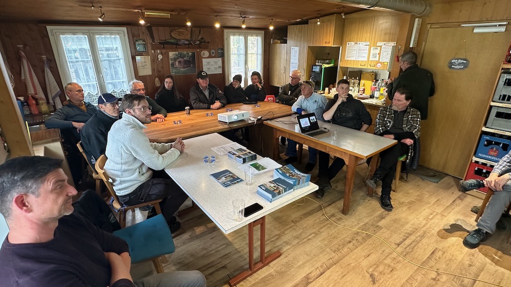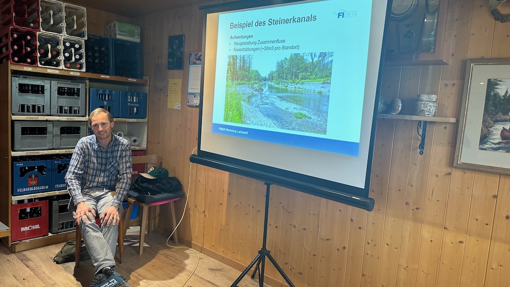 Am Morgen waren wir für den Theorieteil zu Gast im «Fischerhüsli» des Freiangelverein Rupperswil. Andrin Krähenbühl von der Fischereiberatung FIBER, Biologe und selber passionierter Fischer, vermittelte uns auf anschauliche und gut verständliche Art wie und wo Fische laichen und welche Aspekte dabei eine relevante Rolle spielen. Anhand von vielen praktischen Beispiel lernten wir dann, wann man Laichgruben von Forellen erkennen und dann auch mit der App von FIBER Kartieren kann. Anhand von interessanten Statistiken von verschiedenen Schweizer Fliessgewässer erklärte er uns zudem die Zusammenhänge vom Laichgeschäft der Forellen mit Wassertemperatur und Winterhochwasser sowie der Bedeutung von Hochwasser und Geschiebeveränderungen in der Zeit vor dem Laichgeschäft. Unser Ehrenmitglied Rolf Aklin erklärte uns, vorbereitend für den Nachmittag, die Massnahmen, welche im unteren Steinerkanal getroffen wurden, um bessere Laichbedingungen für die Forellen zu schaffen.
