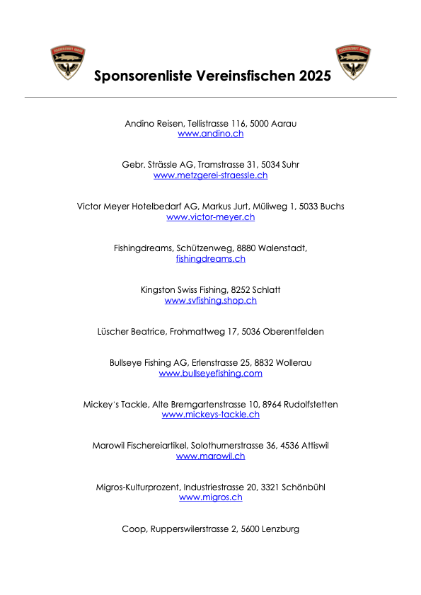 Die Fischerzunft Aarau bedankt sich bei allen Spendern von ganzem Herzen für die überaus grosszügigen Preise und bittet die Fischerzunft-Mitglieder die Sponsoren bei ihren Einkäufen zu berücksichtigen. Die entsprechende Sponsorenliste findet ihr unterhalb der Fotos.
